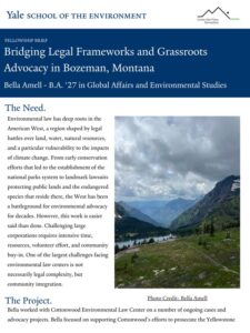 Bella Amell – Western Resource Fellow | Bella is a student in Yale College studying Global Affairs and Environmental Studies, with a concentration in environmental law and policy. She was born and raised in the beautiful Brunswick, Maryland, and is passionate about advocating for environmental justice and ecosystem conservation in rural communities. Elsewhere on campus, you can find her singing with her acapella group, the New Blue of Yale, crafting the perfect cup of coffee at the Silliman Acorn, or representing her residential college community as a Senator on the Yale College Council. See what Bella has been up to.
