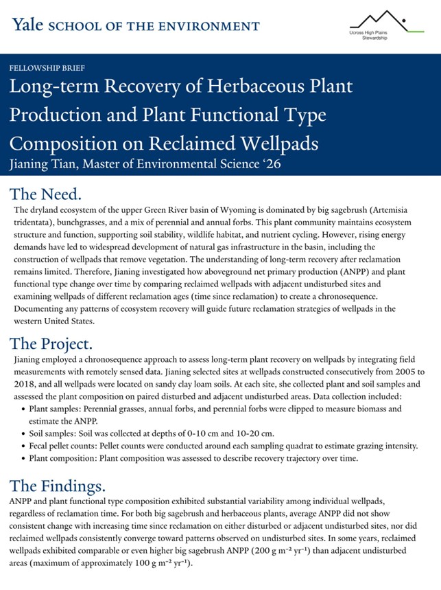Jianing is investigating how aboveground net primary production (ANPP) and plant functional type composition recover over time on reclaimed gas well pads and in adjacent undisturbed areas in Jonah Field. The Jonah Field, located in the Upper Green River Basin of southwestern Wyoming, is a major site of natural gas development within dryland ecosystems. Learn more about the project…